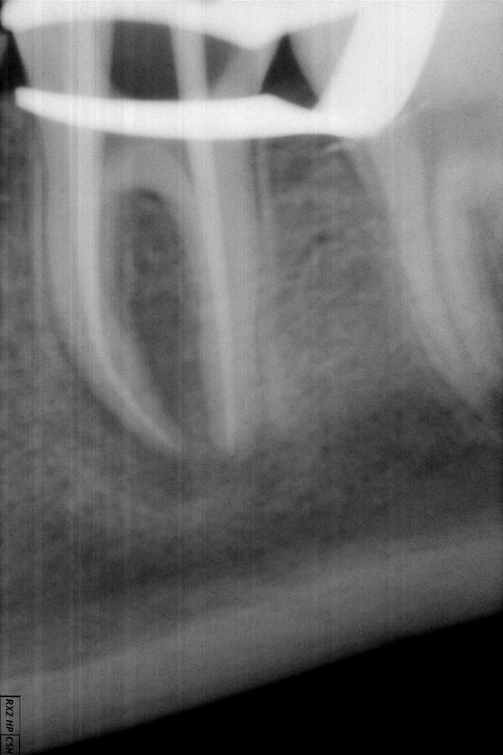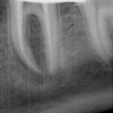 Pacientė kreipėsi dėl krūminio danties endodontinio gydymo. Pacientė skundėsi burnos ertmėje, pažeisto danties projekcijoje, atsiradusia fistule („pūlinuku“). Dantis izoliuotas nuo seilių koferdamu, išvalyti karieso pažeisti audiniai, suformuota ertmė endodontiniam gydymui, kanalai išvalyti, taikyta kalcio hidroksido terapija. Išnykus fistulei , krūminio danties kanalai užplombuoti.
